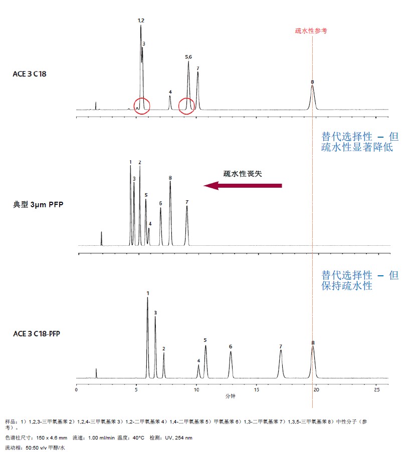 所以,ACE C18-PFP常被用于涉及鹵代芳香族化合物、位置異構(gòu)體和具有不同形狀約束的分析物的分離。