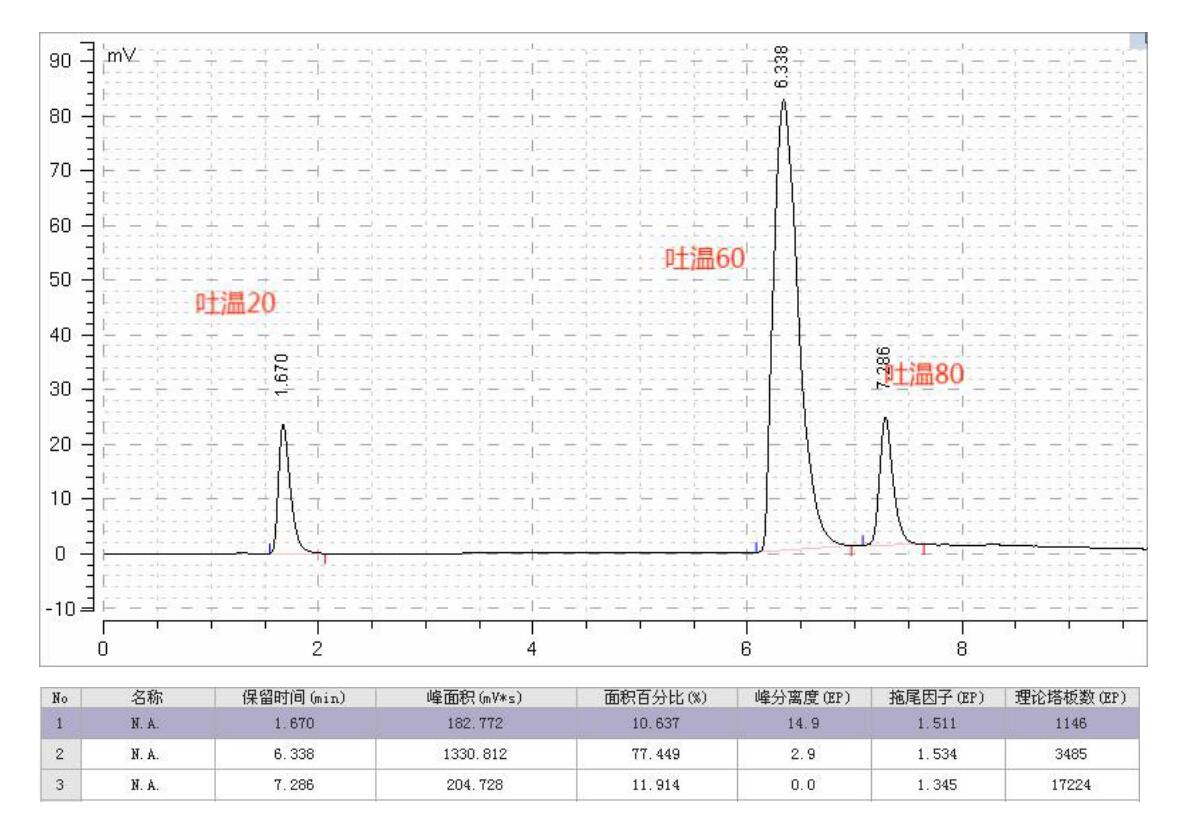 說明:Mercury Tween 吐溫專用色譜柱可實(shí)現(xiàn)吐溫 20,吐溫 60 和吐溫 80 的一次性分析,峰形良好。