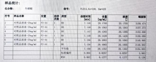 用牛磺酸標樣做重現性實驗,用 20ug/mL 濃度的標樣 6 針,其保留時間的相對標準偏差(RSD)是 0.062%, 峰面積的相對標準偏差(RSD)是 0.126%。