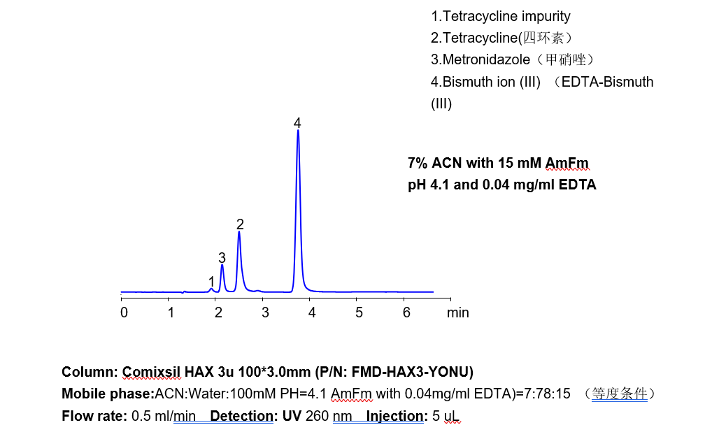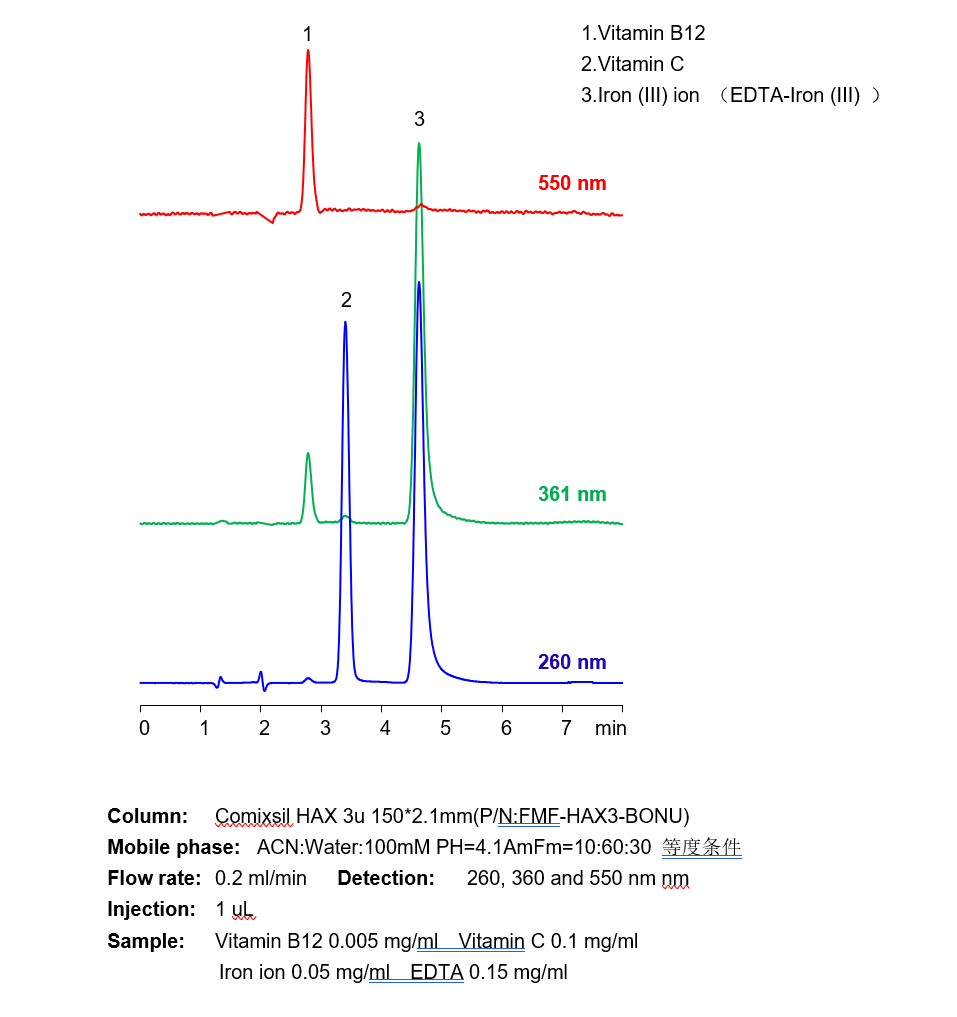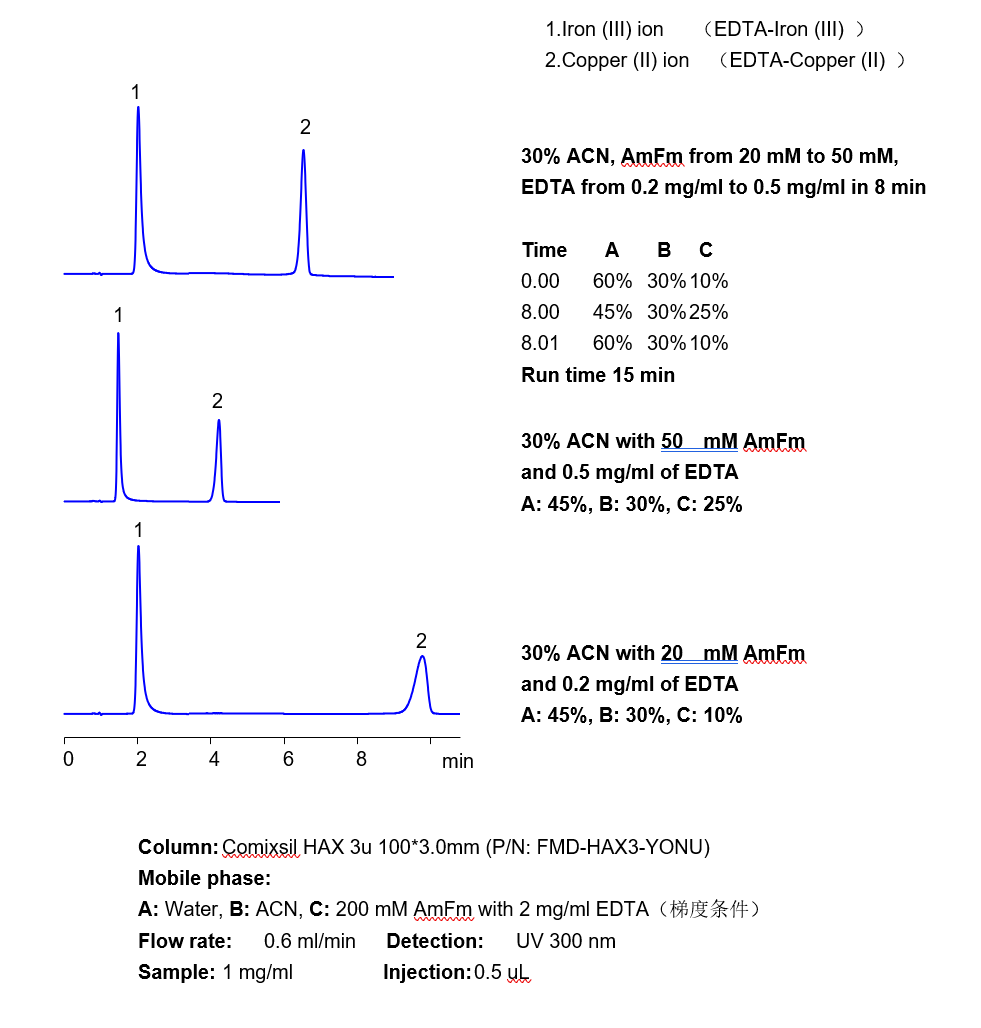 三價鐵離子等三價金屬離子,在硅膠基質的色譜柱中極易死吸附,從而損壞色譜柱,在液相直接檢測中存在較大難度。 本方法研究三價鐵離子與EDTA形成紫外可見的強吸收絡合物,再通過Comixsil HAX色譜柱保留。通過對絡合物的定量從而定量三價鐵離子等三價金屬離子。 應用一:三價鐵離子的檢測 方法A、三價鐵離子流動相中與EDTA絡合