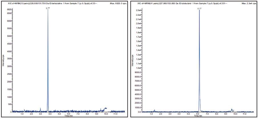 圖 5 特布他林(terbutaline)(226.0/151.7)色譜圖 圖 6 妥布特羅(tulcbutclol)(227.9/153.8)色譜圖