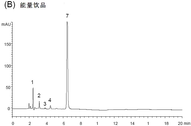 進樣體積:4μL(標(biāo)品濃度為 50μg/mL;能量飲品用乙腈/水(80/20)稀釋 10 倍)