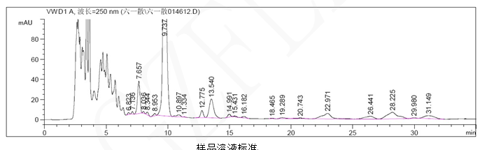 中國藥典規(guī)定理論塔板數(shù)按甘草酸銨應(yīng)不低于3000,本試驗(yàn)實(shí)際測出柱效為6143。